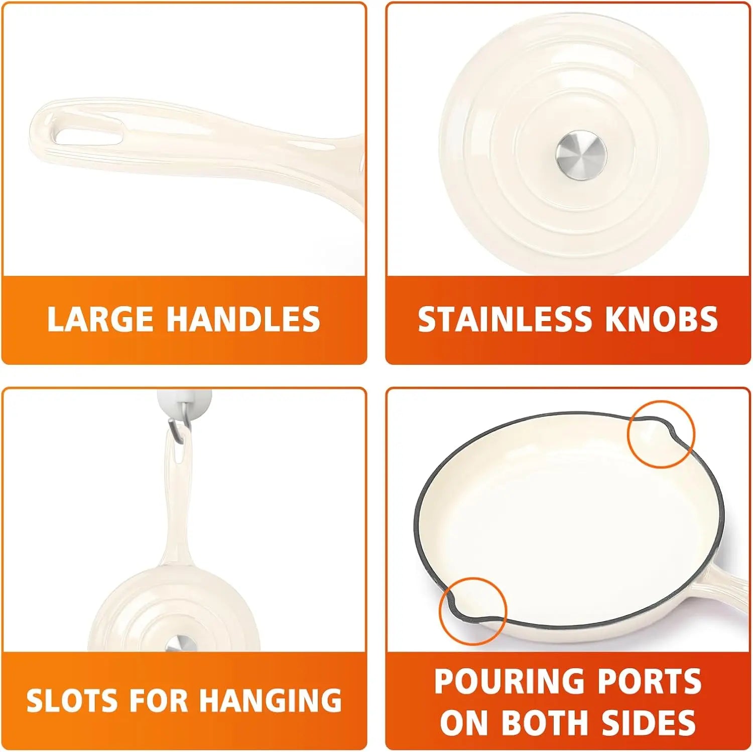 [User-Friendly Design with Thoughtful Features] - Each piece in this enameled cast iron pots and pans set includes ergonomic handles for easy transfer from stovetop to oven, and the lids feature stainless steel knobs for durability. The skillet is designed with pouring spouts on both sides for drip-free serving, while the handles include perforations, making storage convenient and adding style to your kitchen and table.